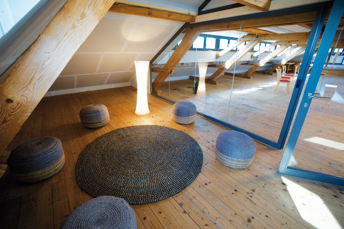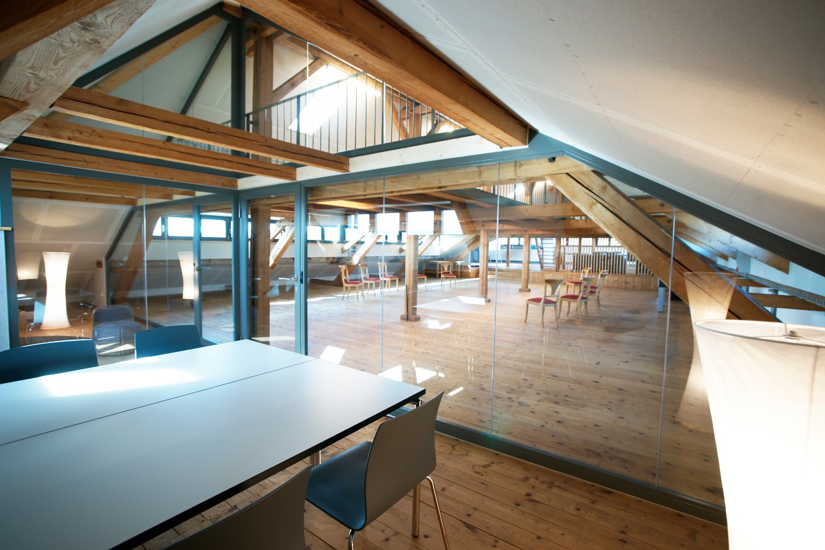Den Seminarraum der Empathie-Werkstatt® GmbH für die Module 3 bis 5 sowie das Themenseminar finden Sie fernab der Hektik des Alltags im ländlich-pittoresken Wigoltingen. Aber der Weg ins gemächliche Zentrum des Thurgaus lohnt sich: Hier finden Sie nicht nur eine entschleunigte und inspirierende Lernatmosphäre, um sich auf sich selbst und andere einzulassen, sondern auch faszinierende Architektur. Der ausgebaute Dachstock einer alten Fabrik versprüht auf seinen 300 m2, die sich über drei Etagen erstrecken, einen ganz eigenen Charme. Das imposant in Szene gesetzte Gebälk des Dachstuhls und die Säulen vermitteln Raum und Weite, die harmonisch integrierten Glaswände geben Transparenz – ein idealer Ort, um sich selbst zu entfalten.